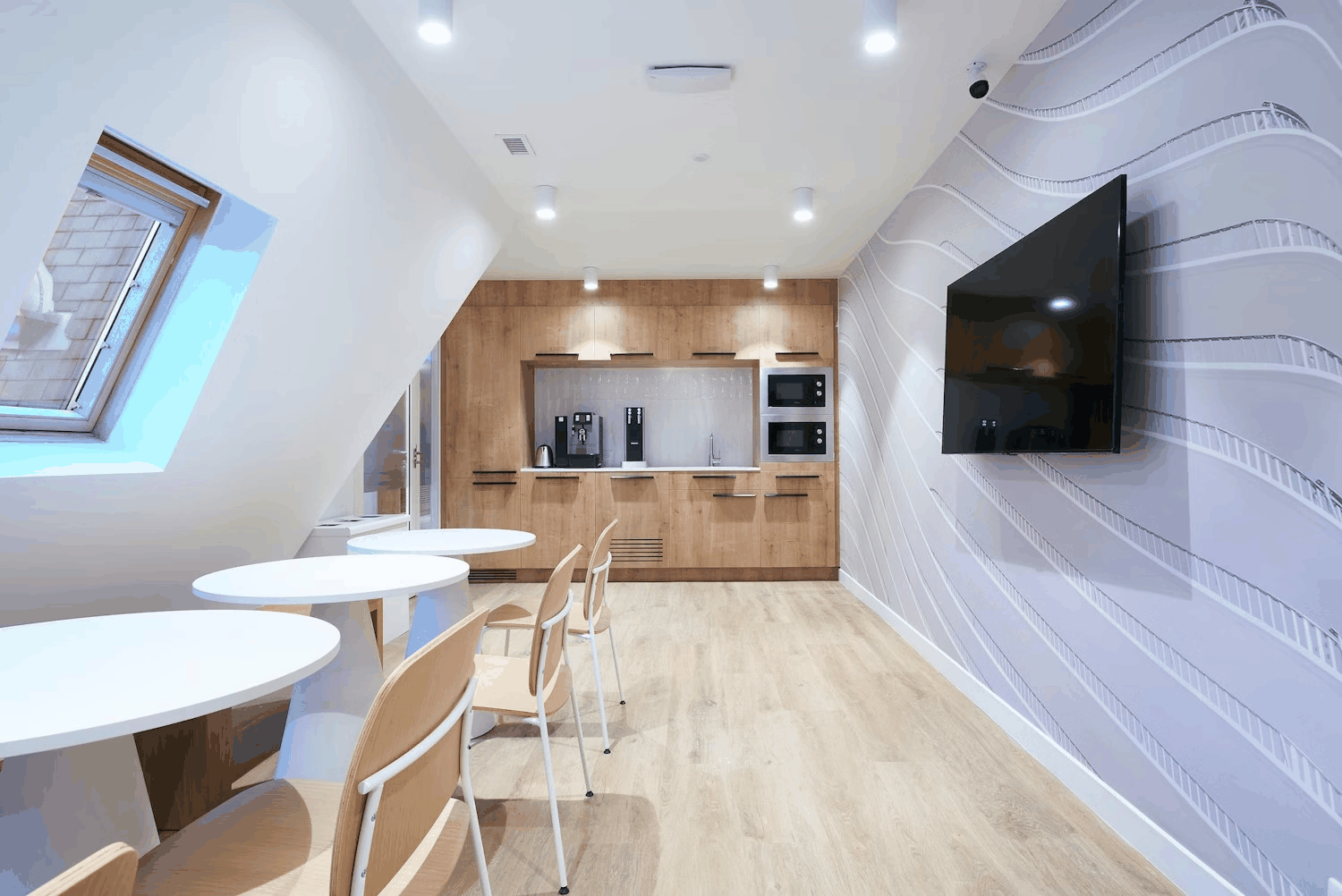 🔷 Aménagements : grand espace détente, cuisine aménagée, salles de réunion et phonebooth