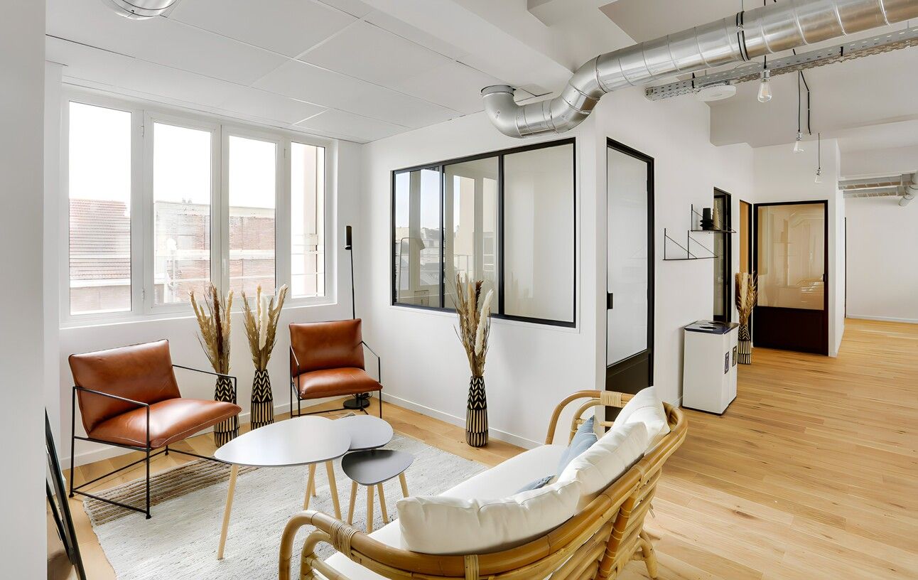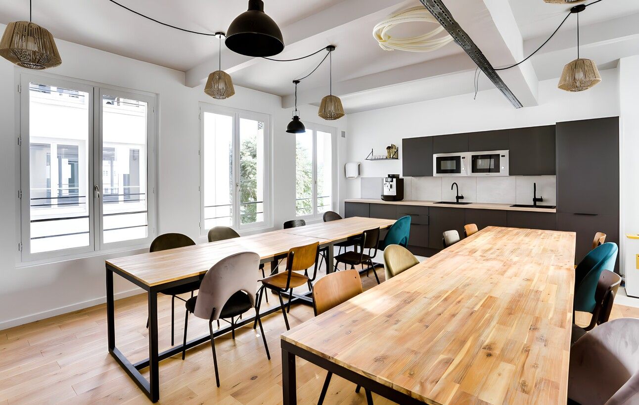 Bureaux clés en mains organisés en espaces ouverts, salles de réunion, espace détente et cuisine